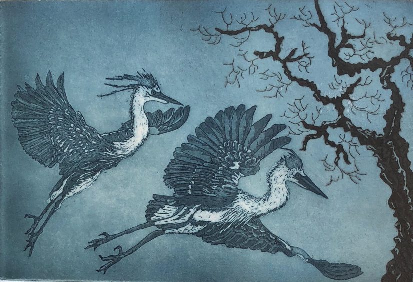 This etching is a chine colle. I etched the woman’s outline on the plate and then lost my direction, so I put it away for a couple years. Eventually I put the tree in and then to balance it I added the tattoos. I spent a lot of time trying to balance this piece – I learned that it pays to plan a little more.