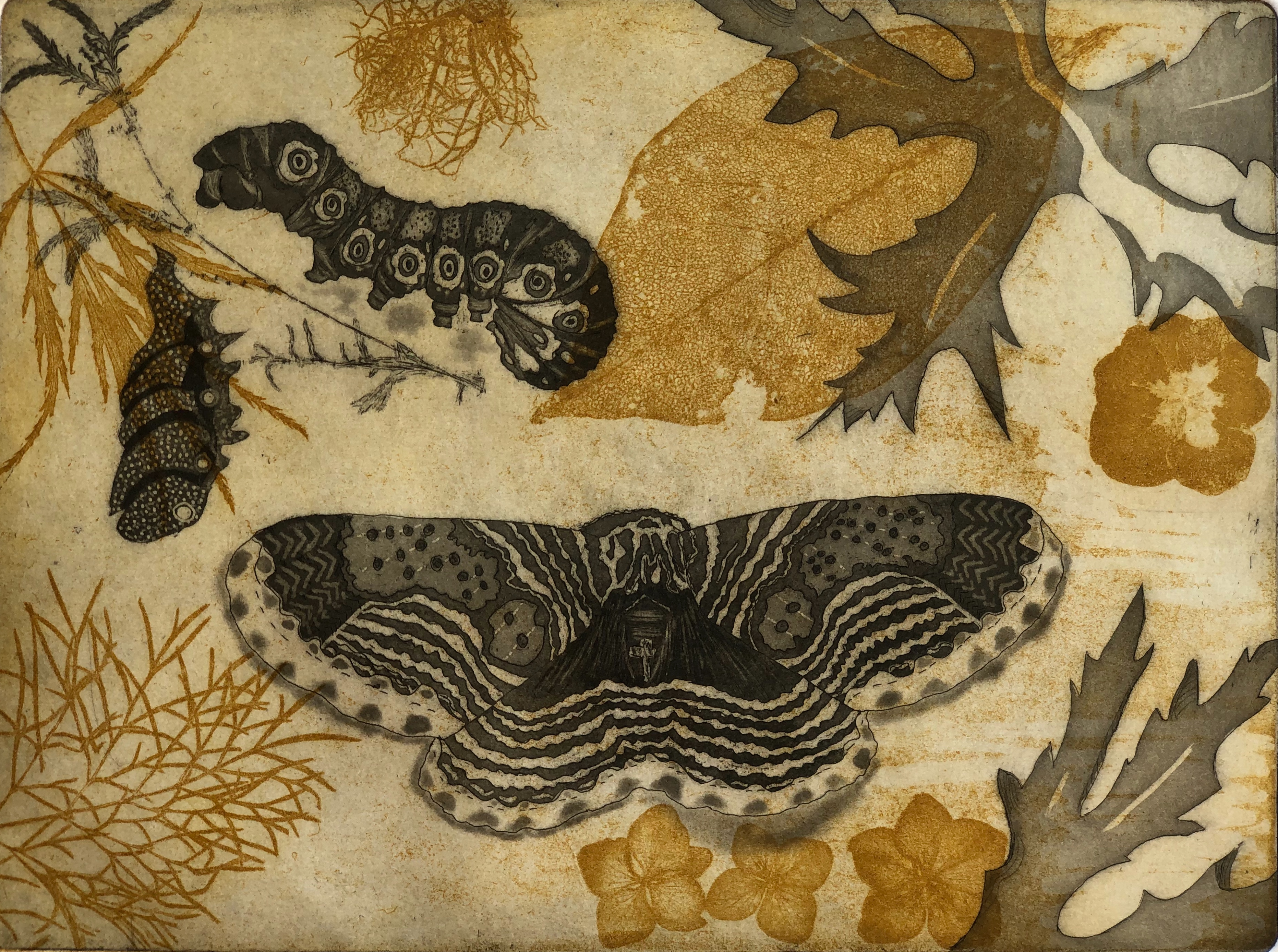 This etching is a chine colle. I etched the woman’s outline on the plate and then lost my direction, so I put it away for a couple years. Eventually I put the tree in and then to balance it I added the tattoos. I spent a lot of time trying to balance this piece – I learned that it pays to plan a little more.
